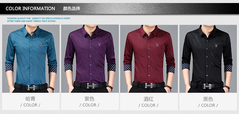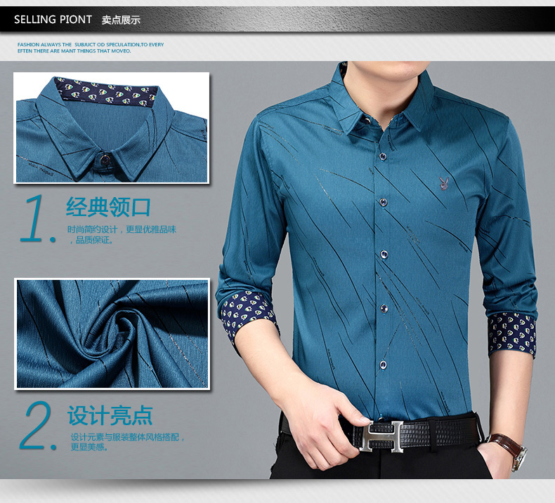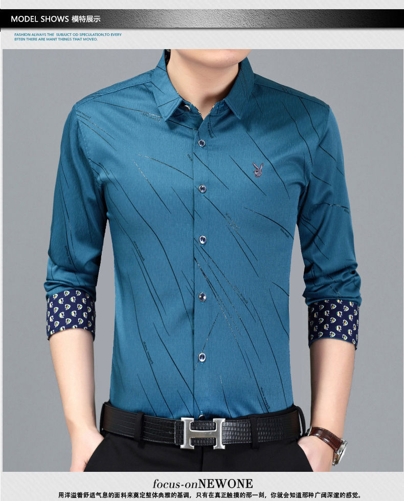 花花公子春季男士长袖衬衫免烫中青年休闲衬衣潮流男装印花衬衣