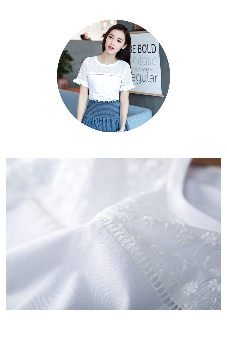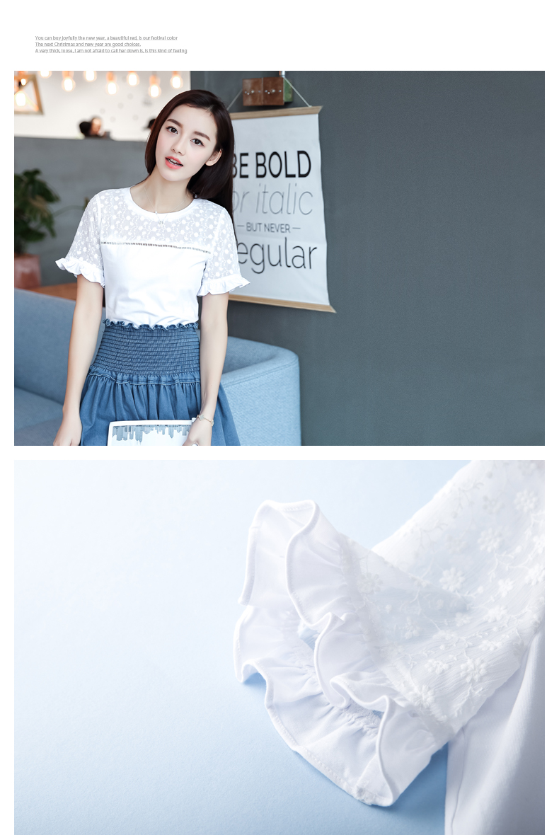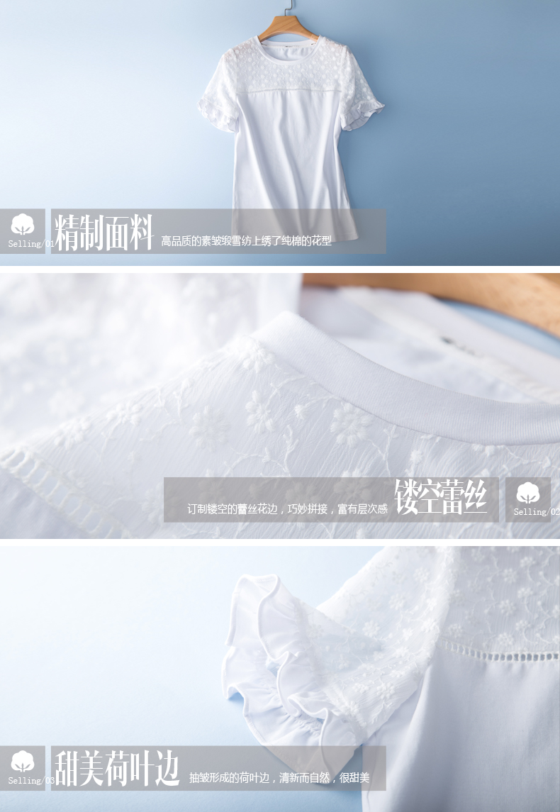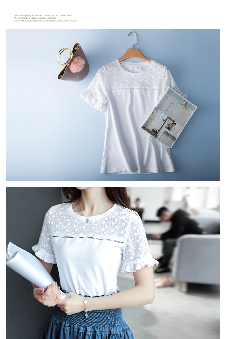 产品名称:白色T恤女短袖蕾丝上衣棉立方2025夏新款女装修身韩版圆领雪纺衫