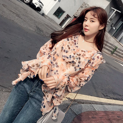 润乙一夏装2025新款女雪纺衫上衣超仙甜美碎花V领荷叶chic一字肩