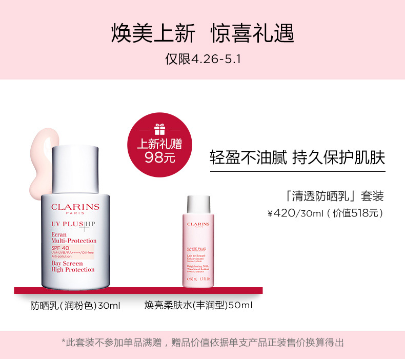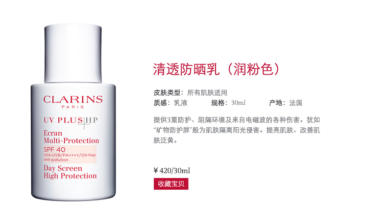 产品名称:娇韵诗隔离 清透防晒乳SPF30PA++++(粉色)30ml透亮