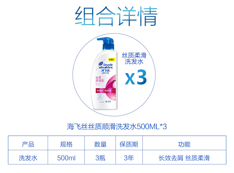 - 产品名称:海飞丝 丝质柔滑型去屑洗发水500ml*3