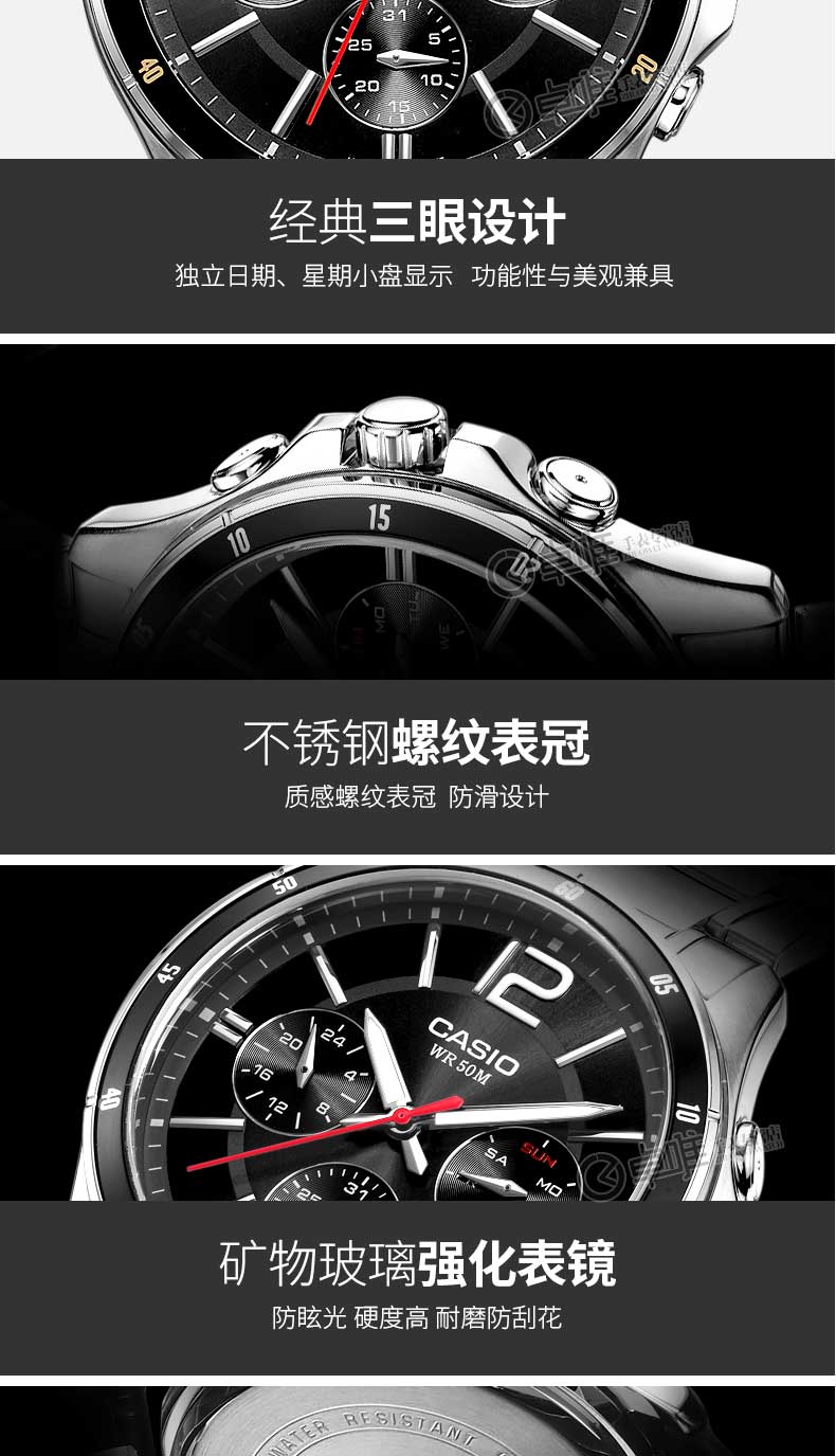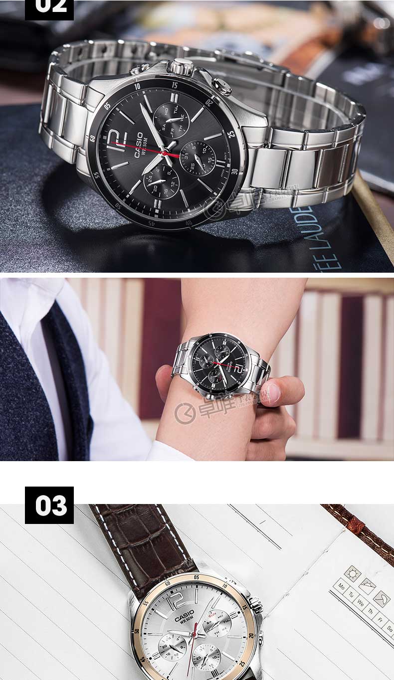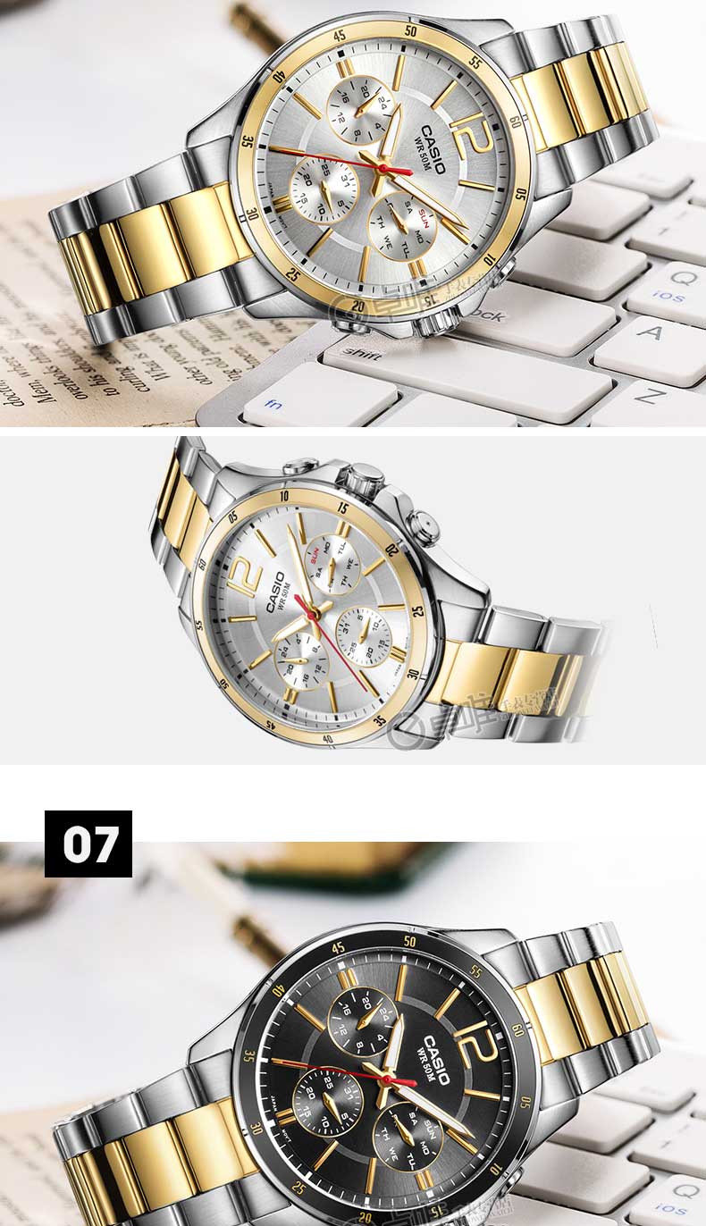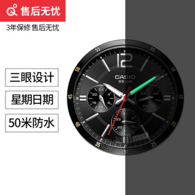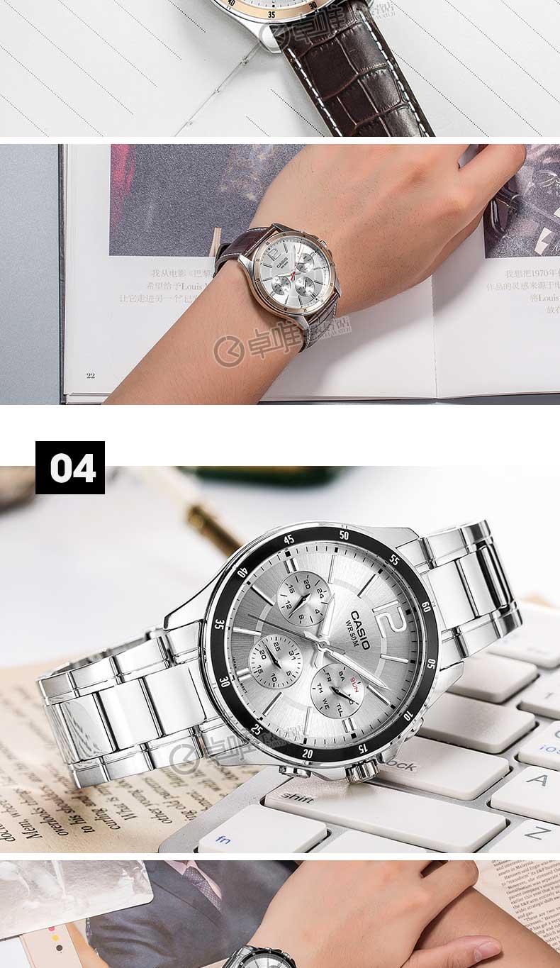 卡西欧CASIO手表男士正品防水精钢带MTP-1374D-7A三眼休闲石英表