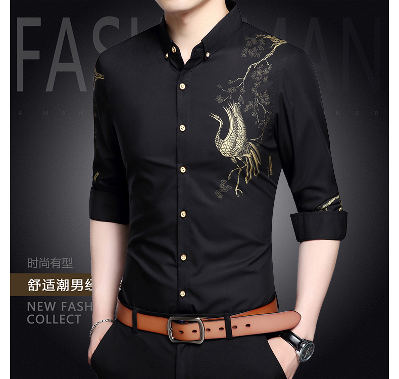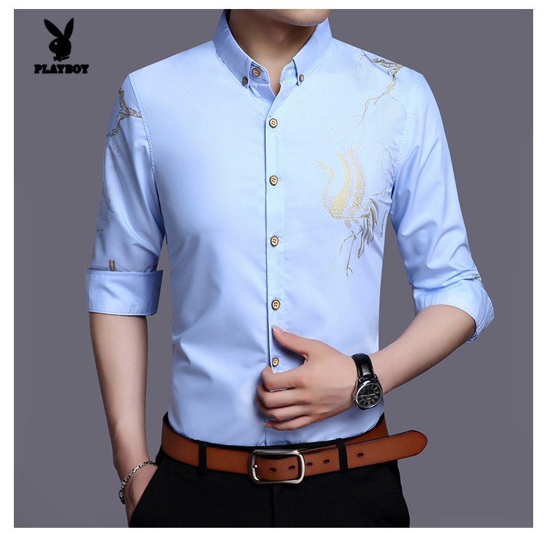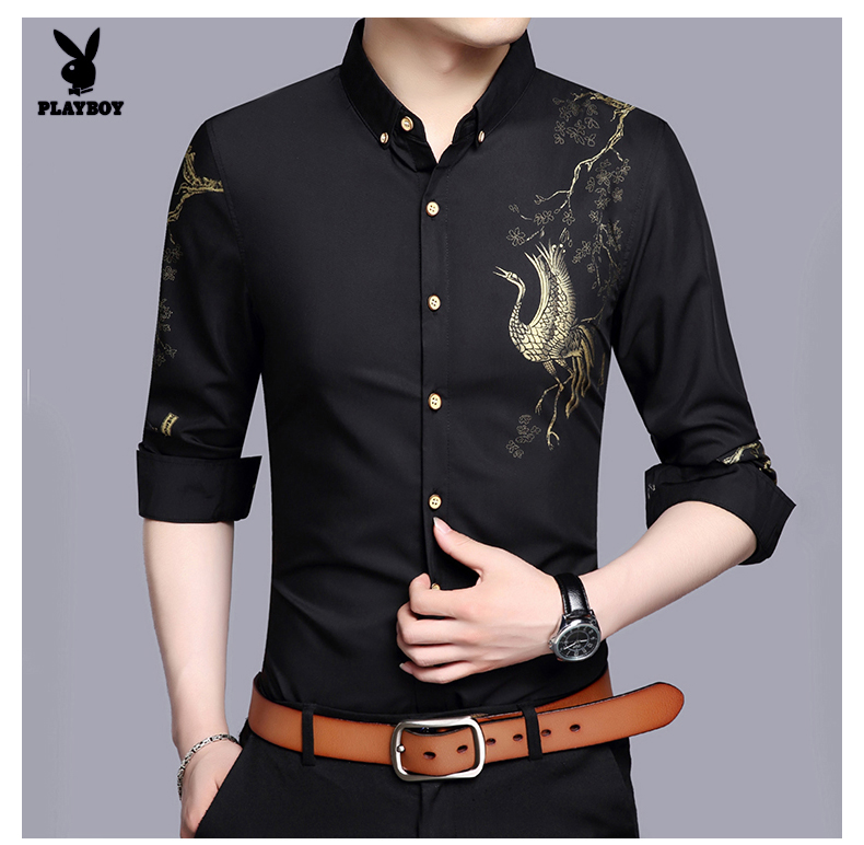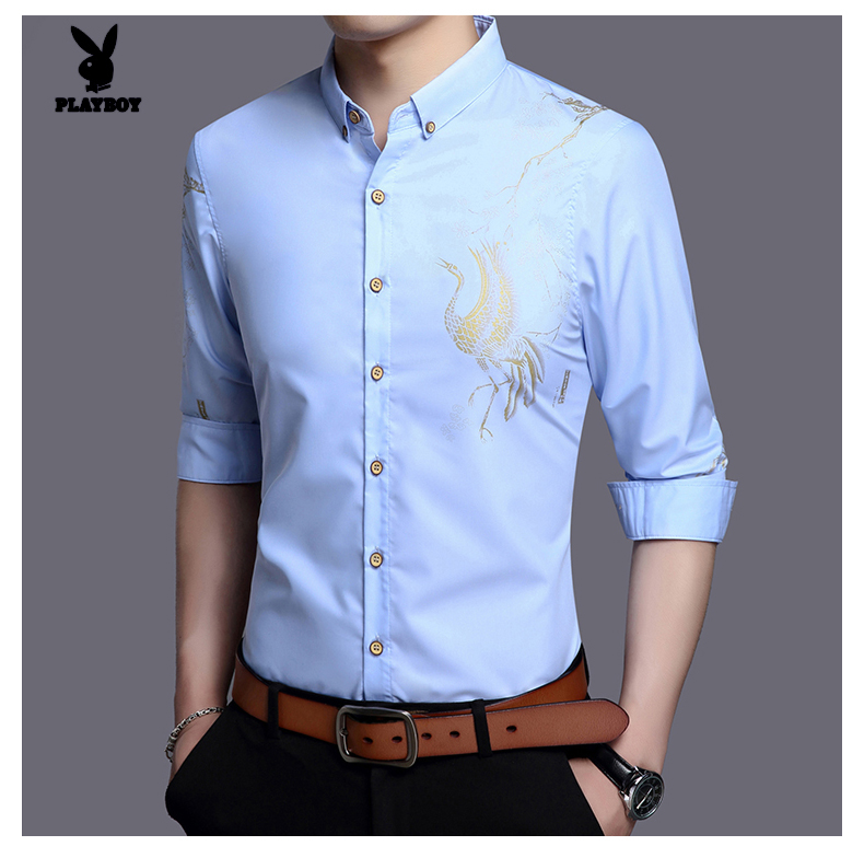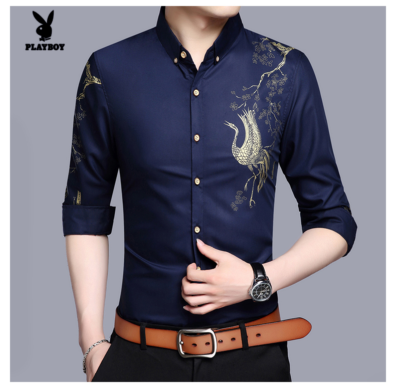 花花公子长袖衬衫男士印花翻领薄款商务休闲衬衣中青年秋款男装潮