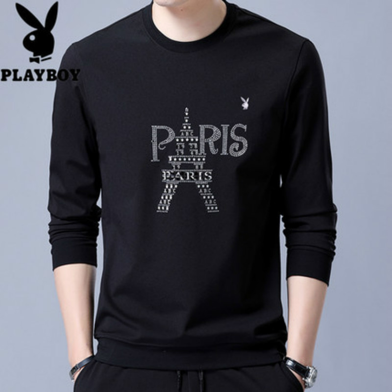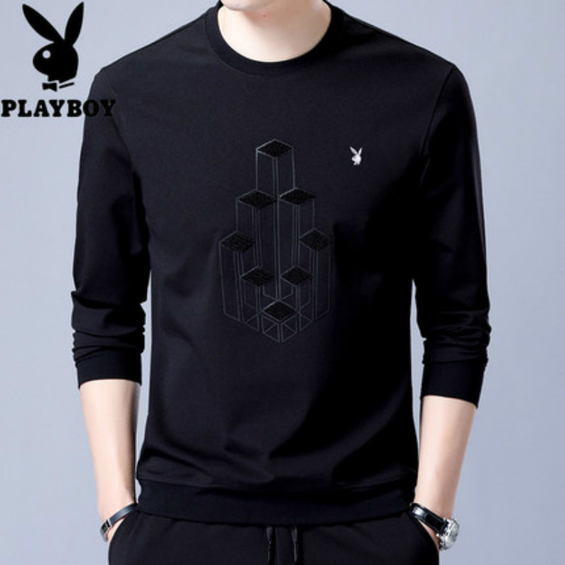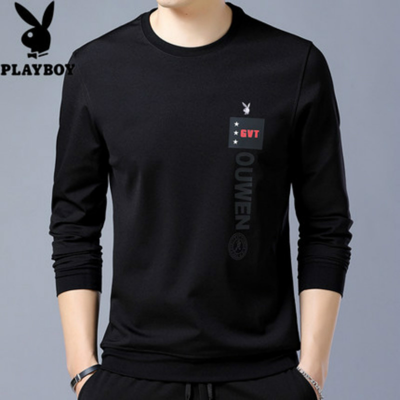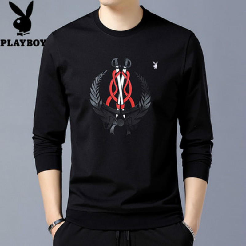 花花公子春季卫衣男装圆领套头长袖t恤青年男士简约绣花打底衫潮