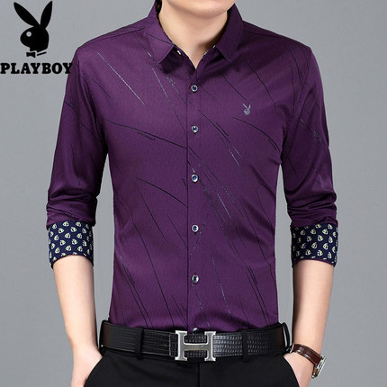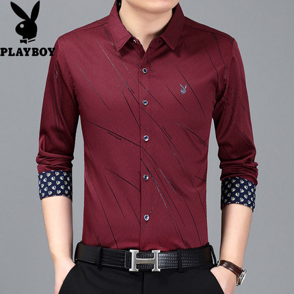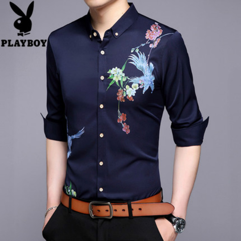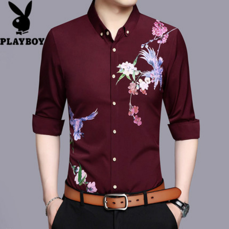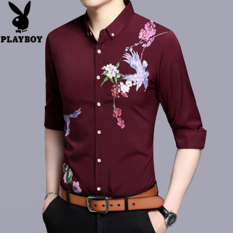 花花公子长袖衬衫男士印花翻领薄款商务休闲衬衣中青年秋款男装潮