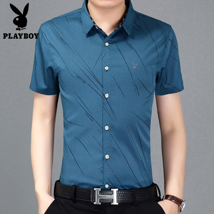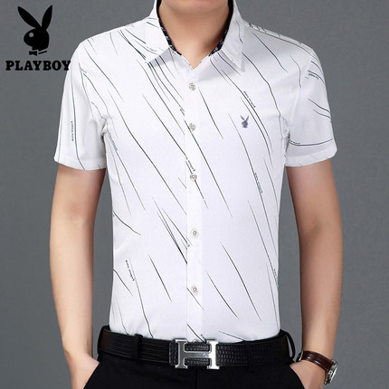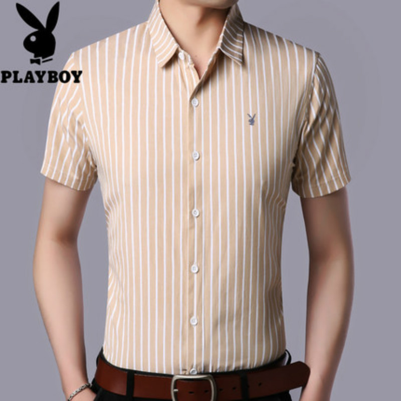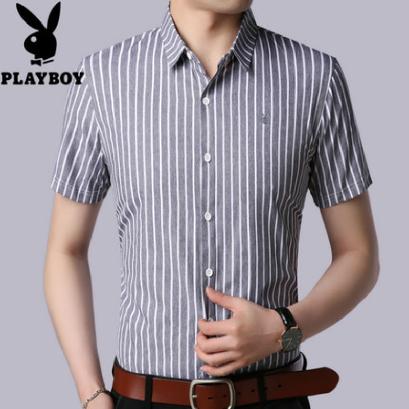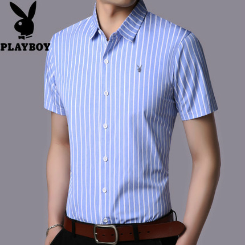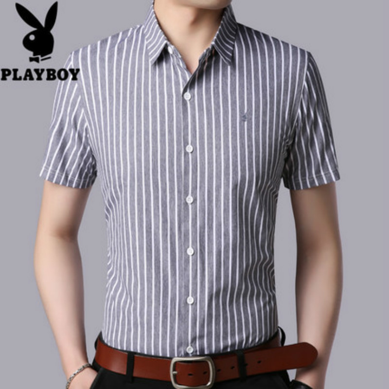 花花公子男士短袖衬衫条纹修身商务休闲青年免烫短袖衬衣男寸衫潮